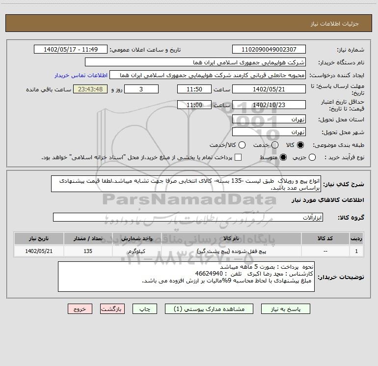 شرح کلی نیاز: انواع پیچ و روپلاک طبق لیست -135 بسته- کالای انتخابی صرفا جهت تشابه میباشد.لطفا قیمت پیشنهادی براساس عدد باشد.