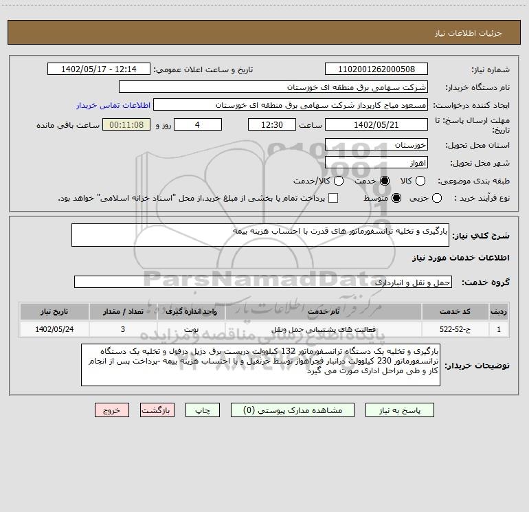 شرح کلی نیاز: بارگیری و تخلیه ترانسفورماتور های قدرت با احتساب هزینه بیمه
