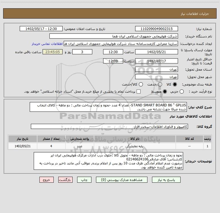 شرح کلی نیاز: STAND SMART BOARD 86 “ GPLUS- تعداد 4 عدد -نحوه و زمان پرداخت مالی : دو ماهه - کالای انتخاب شده صرفا جهت تشابه می باشد.