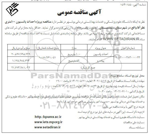 نظر به اینكه دانشگاه علوم پزشكی و خدمات بهداشتی درمانی بوشهر در نظر دارد مناقصه پروژه احداث پانسیون 100 متری نظرآقا واقع در شهرستان دشتستان را به صورت یک مرحله ای با ارزیابی فشرده برگزار نماید . حداقل پایه مجاز برای شرکتهای ساختمانی شرکت کننده در مناقصه رتبه 5 ابنیه می باشد ، وفق برنامه زمانبندی شده ذیل نسبت به اخذ اسناد مناقصه از طریق سامانه ستاد اقدام نمایند.