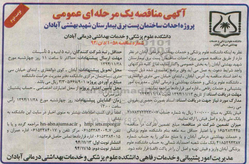 دانشکده علوم پزشکی و خدمات بهداشتی درمانی آبادان در نظر دارد از طریق مناقصه عمومی پروژه احداث ساختمان پست برق بیمارستان شهید بهشتی آبادان را به بخش خصوصی واگذار نماید.
