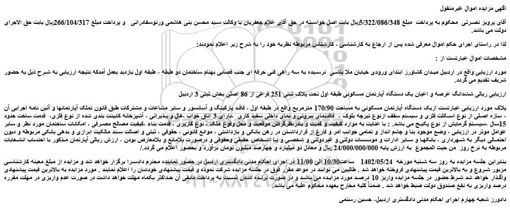 مزایده فروش ششدانگ عرصه و اعیان یک دستگاه آپارتمان مسکونی طبقه اول تحت پلاک ثبتی 251 فرعی از 86 اصلی , مزایده فروش ششدانگ عرصه و اعیان یک دستگاه آپارتمان مسکونی طبقه اول تحت پلاک ثبتی 251 فرعی از 86 اصلی