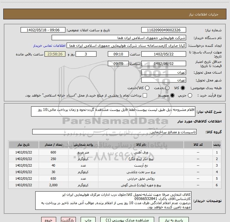 استعلام اقلام مشروحه ذیل طبق لیست پیوست-لطفا فایل پیوست مشاهده گردد-نحوه و زمان پرداخت مالی:10 روز, استعلام اقلام مشروحه ذیل طبق لیست پیوست-لطفا فایل پیوست مشاهده گردد-نحوه و زمان پرداخت مالی:10 روز