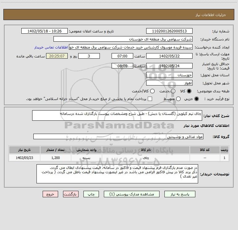 استعلام چای نیم کیلویی (گلستان یا دبش) - طبق شرح ومشخصات پیوست بارگذاری شده درسامانه, استعلام چای نیم کیلویی (گلستان یا دبش) - طبق شرح ومشخصات پیوست بارگذاری شده درسامانه