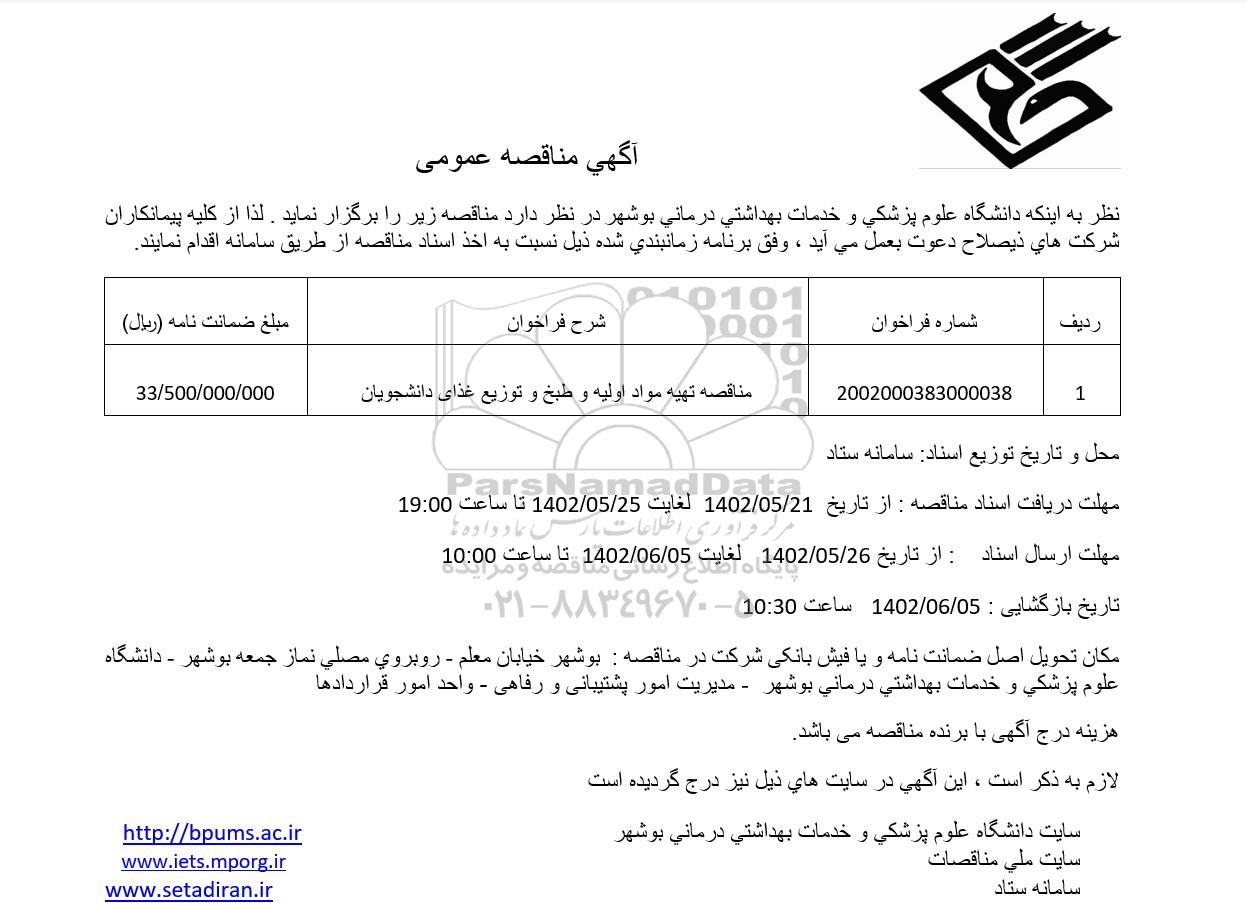 نظر به اینكه دانشگاه علوم پزشكی و خدمات بهداشتی درمانی بوشهر در نظر دارد مناقصه زیر را برگزار نماید. لذا از کلیه پیمانکاران شرکت های ذیصلاح دعوت به عمل می آید ، وفق برنامه زمان بندی شده ذیل نسبت به اخذ اسناد مناقصه از طریق سامانه اقدام نمایند.