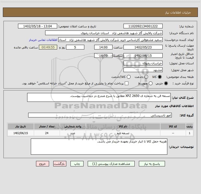 نام دستگاه خریدار:شرکت پالایش گاز شهید هاشمی نژاد استان خراسان رضوی