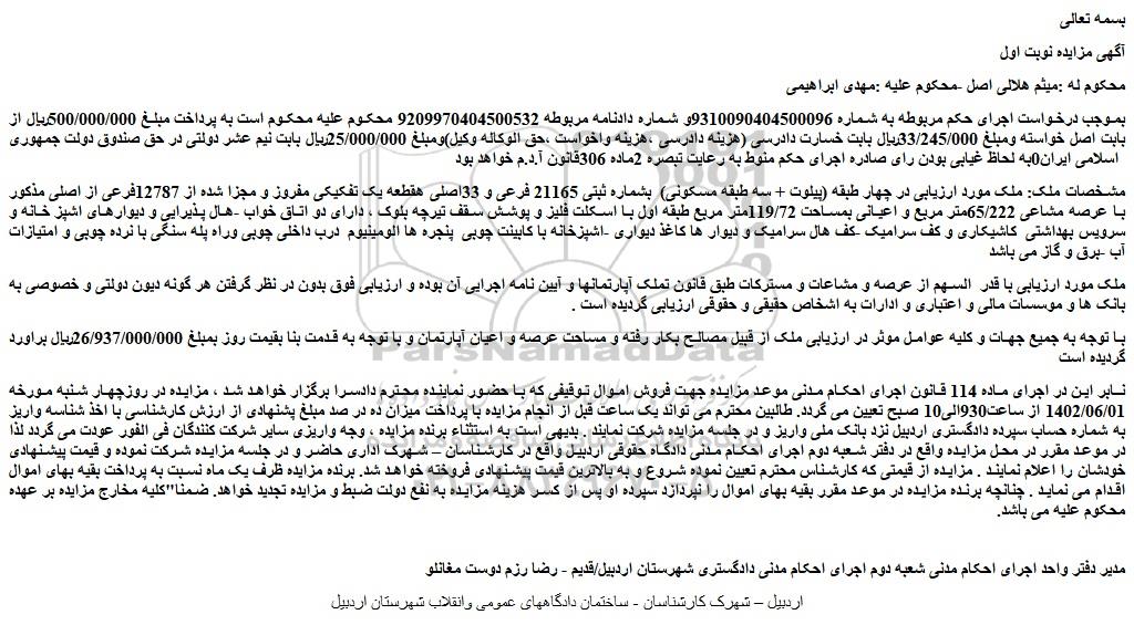 نابر این در اجرای ماده 114 قانون اجرای احکام مدنی موعد مزایده جهت فروش اموال توقیفی که با حضور نماینده محترم دادسرا برگزار خواهد شد ، مزایده در روزچهار شنبه مورخه 1402/06/01 از ساعت930الی10 صبح تعیین می گردد. طالبین محترم می تواند یک ساعت قبل از انجام مزایده با پرداخت میزان ده در صد مبلغ پشنهادی از ارزش کارشناسی با اخذ شناسه واریز به شماره حساب سپرده دادگستری اردبیل نزد بانک ملی واریز و در جلسه مزایده شرکت نمایند . بدیهی است به استثناء برنده مزایده ، وجه واریزی سایر شرکت کنندگان فی الفور عودت می گردد لذا در موعد مقرر در محل مزایده واقع در دفتر شعبه دوم اجرای احکام مدنی دادگاه حقوقی اردبیل واقع در کارشناسان – شهرک اداری حاضر و در جلسه مزایده شرکت نموده و قیمت پیشنهادی خودشان را اعلام نمایند . مزایده از قیمتی که کارشناس محترم تعیین نموده شروع و به بالاترین قیمت پیشنهادی فروخته خواهد شد. برنده مزایده ظرف یک ماه نسبت به پرداخت بقیه بهای اموال اقدام می نماید . چنانچه برنده مزایده در موعد مقرر بقیه بهای اموال را نپردازد سپرده او پس از کسر هزینه مزایده به نفع دولت ضبط و مزایده تجدید خواهد. ضمنا"کلیه مخارج مزایده بر عهده محکوم علیه می باشد.