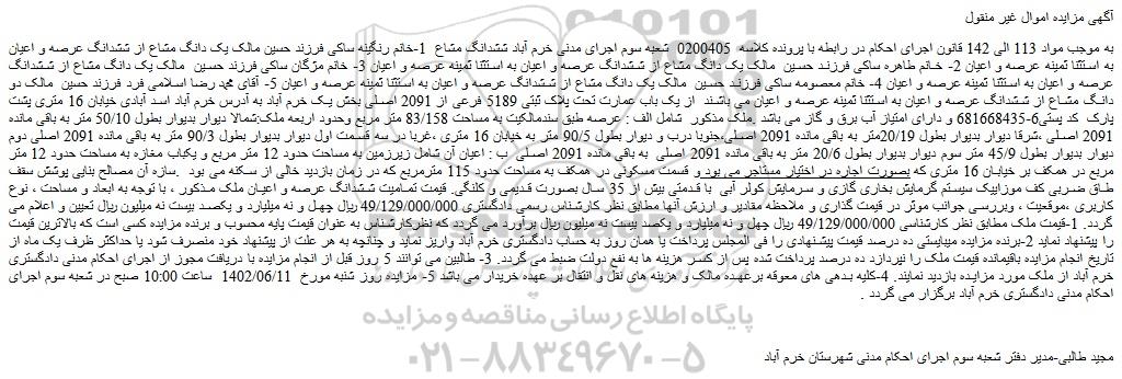 به موجب مواد 113 الی 142 قانون اجرای احکام در رابطه با پرونده کلاسه 0200405 شعبه سوم اجرای مدنی خرم آباد ششدانگ مشاع 1-خانم رنگینه ساکی فرزند حسین مالک یک دانگ مشاع از ششدانگ عرصه و اعیان به استثنا ثمینه عرصه و اعیان 2- خانم طاهره ساکی فرزند حسین مالک یک دانگ مشاع از ششدانگ عرصه و اعیان به استثنا ثمینه عرصه و اعیان 3- خانم مژگان ساکی فرزند حسین مالک یک دانگ مشاع از ششدانگ عرصه و اعیان به استثنا ثمینه عرصه و اعیان 4- خانم معصومه ساکی فرزند حسین مالک یک دانگ مشاع از ششدانگ عرصه و اعیان به استثنا ثمینه عرصه و اعیان 5- آقای محمد رضا اسلامی فرد فرزند حسین مالک دو دانگ مشاع از ششدانگ عرصه و اعیان به استثنا ثمینه عرصه و اعیان می باشند از یک باب عمارت تحت پلاک ثبتی 5189 فرعی از 2091 اصلی بخش یک خرم آباد به آدرس خرم آباد اسد آبادی خیابان 16 متری پشت پارک کد پستی6-681668435 و دارای امتیاز آب برق و گاز می باشد .ملک مذکور شامل الف : عرصه طبق سندمالکیت به مساحت 83/158 متر مربع وحدود اربعه ملک:شمالا دیوار بدیوار بطول 50/10 متر به باقی مانده 2091 اصلی ،شرقا دیوار بدیوار بطول 20/19متر به باقی مانده 2091 اصلی،جنوبا درب و دیوار بطول 90/5 متر به خیابان 16 متری ،غربا در سه قسمت اول دیوار بدیوار بطول 90/3 متر به باقی مانده 2091 اصلی دوم دیوار بدیوار بطول 45/9 متر سوم دیوار بدیوار بطول 20/6 متر به باقی مانده 2091 اصلی به باقی مانده 2091 اصلی ب : اعیان آن شامل زیرزمین به مساحت حدود 12 متر مربع و یکباب مغازه به مساحت حدود 12 متر مربع در همکف بر خیابان 16 متری که بصورت اجاره در اختیار مستاجر می بود و قسمت مسکونی در همکف به مساحت حدود 115 مترمربع که در زمان بازدید خالی از سکنه می بود .سازه آن مصالح بنایی پوشش سقف طاق ضربی کف موزاییک سیستم گرمایش بخاری گازی و سرمایش کولر آبی با قدمتی بیش از 35 سال بصورت قدیمی و کلنگی. قیمت تمامیت ششدانگ عرصه و اعیان ملک مذکور ، با توجه به ابعاد و مساحت ، نوع کاربری ،موقعیت ، وبررسی جوانب موثر در قیمت گذاری و ملاحظه مقادیر و ارزش آنها مطابق نظر کارشناس رسمی دادگستری 49/129/000/000 ریال چهل و نه میلیارد و یکصد بیست نه میلیون ریال تعیین و اعلام می گردد. 1-قیمت ملک مطابق نظر کارشناسی 49/129/000/000 ریال چهل و نه میلیارد و یکصد بیست نه میلیون ریال برآورد می گردد که نظرکارشناس به عنوان قیمت پایه محسوب و برنده مزایده کسی است که بالاترین قیمت را پیشنهاد نماید 2-برنده مزایده میبایستی ده درصد قیمت پیشنهادی را فی المجلس پرداخت یا همان روز به حساب دادگستری خرم آباد واریز نماید و چنانچه به هر علت از پیشنهاد خود منصرف شود یا حداکثر ظرف یک ماه از تاریخ انجام مزایده باقیمانده قیمت ملک را نپردازد ده درصد پرداخت شده پس از کسر هزینه ها به نفع دولت ضبط می گردد. 3- طالبین می توانند 5 روز قبل از انجام مزایده با دریافت مجوز از اجرای احکام مدنی دادگستری خرم آباد از ملک مورد مزایده بازدید نمایند. 4-کلیه بدهی های معوقه برعهده مالک و هزینه های نقل و انتقال بر عهده خریدار می باشد 5- مزایده روز شنبه مورخ 1402/06/11 ساعت 10:00 صبح در شعبه سوم اجرای احکام مدنی دادگستری خرم آباد برگزار می گردد .