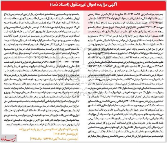 آگهی مزایده اموال غیرمنقول (اسناد ذمه)