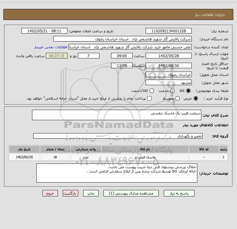 نام دستگاه خریدار:شرکت پالایش گاز شهید هاشمی نژاد استان خراسان رضوی