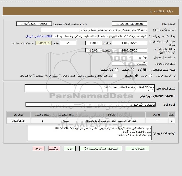 شرح کلی نیاز: دستگاه الایزا ریدر تمام اتوماتیک مدل فایتون 1عدد