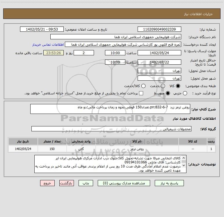 شرح کلی نیاز: روغن ترمز زرد pn:832-6-7،تعداد150 قوطی،نحوه و زمان پرداخت مالی:دو ماه
