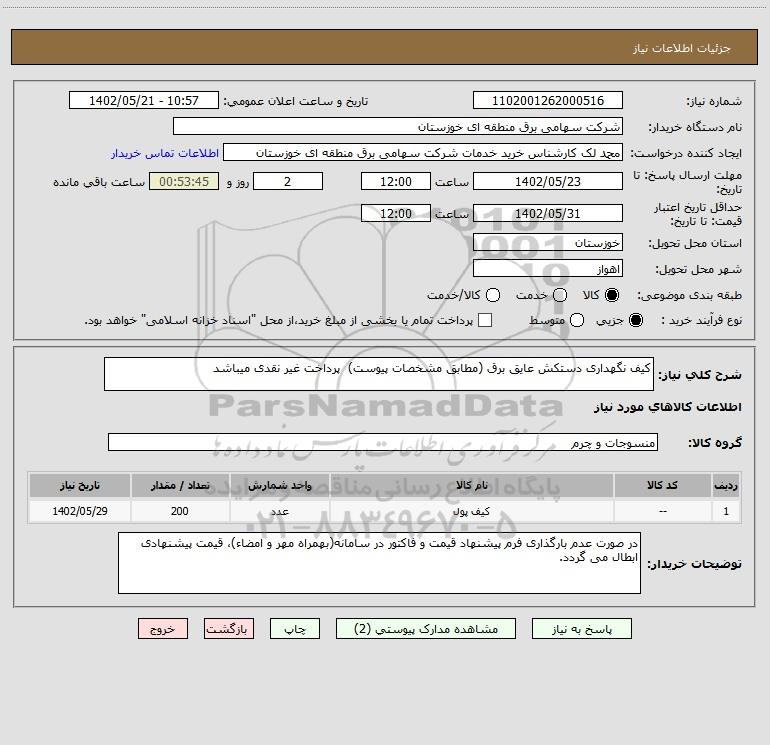 شرح کلی نیاز: کیف نگهداری دستکش عایق برق (مطابق مشخصات پیوست) پرداخت غیر نقدی میباشد