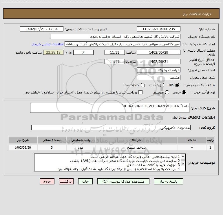 شرح کلی نیاز: ULTRASONIC LEVEL TRANSMITTER "E+D"
