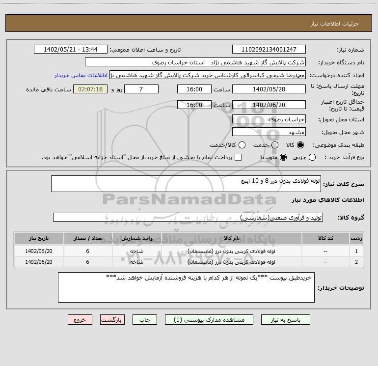 شرح کلی نیاز: لوله فولادی بدون درز 8 و 10 اینچ