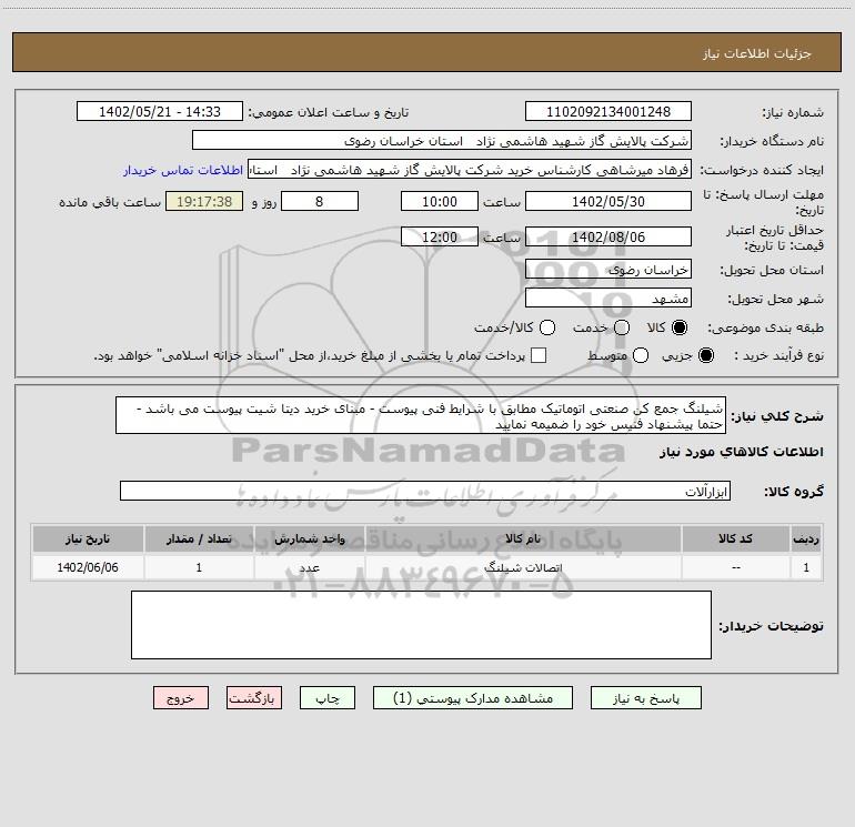 نام دستگاه خریدار:شرکت پالایش گاز شهید هاشمی نژاد استان خراسان رضوی