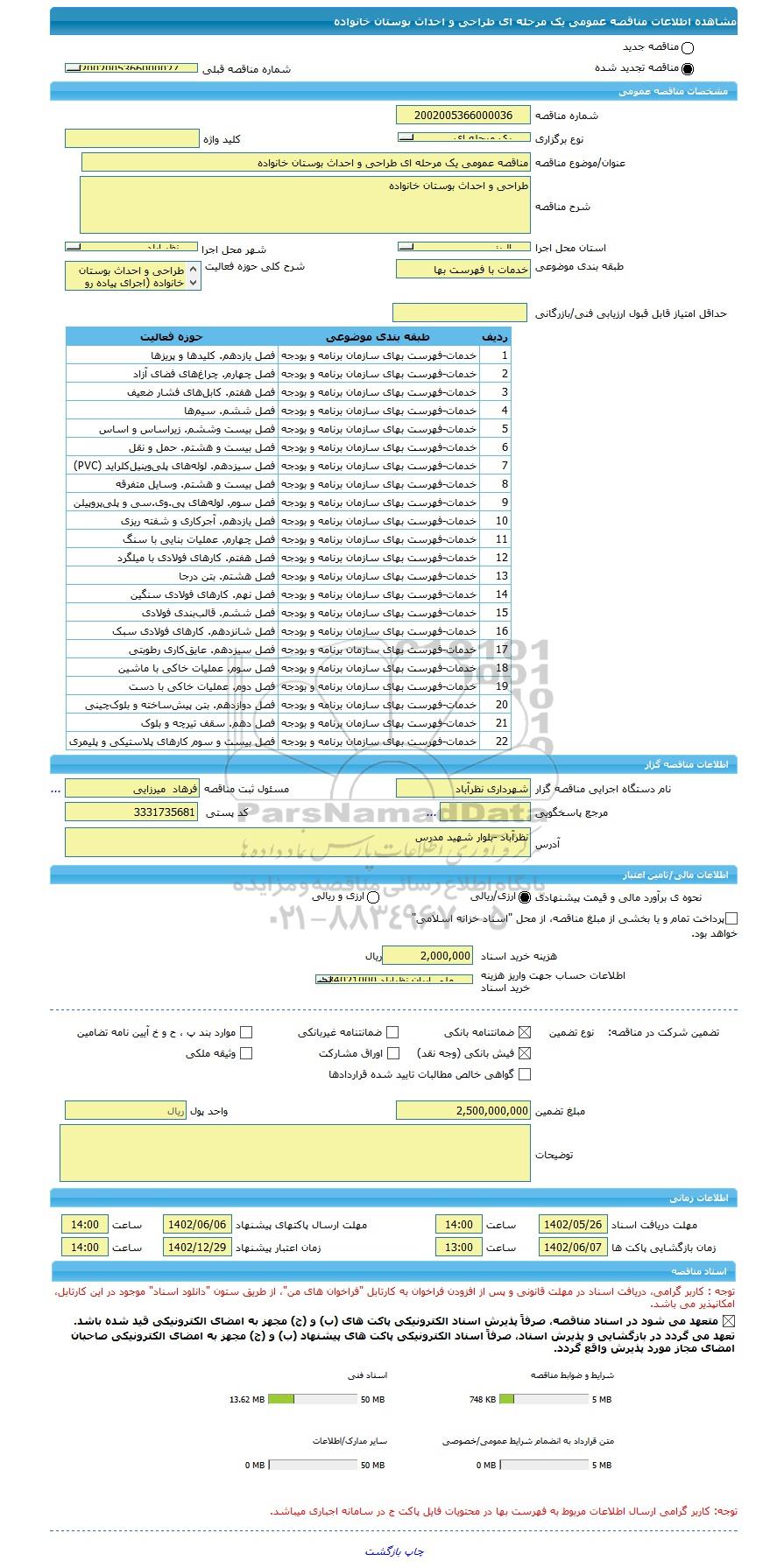 | نام دستگاه اجرایی مناقصه گزار | شهرداری نظرآباد | مسئول ثبت مناقصه | فرهاد میرزایی |