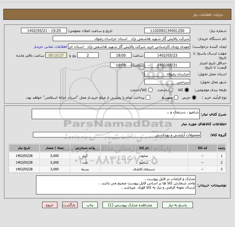 نام دستگاه خریدار:شرکت پالایش گاز شهید هاشمی نژاد استان خراسان رضوی