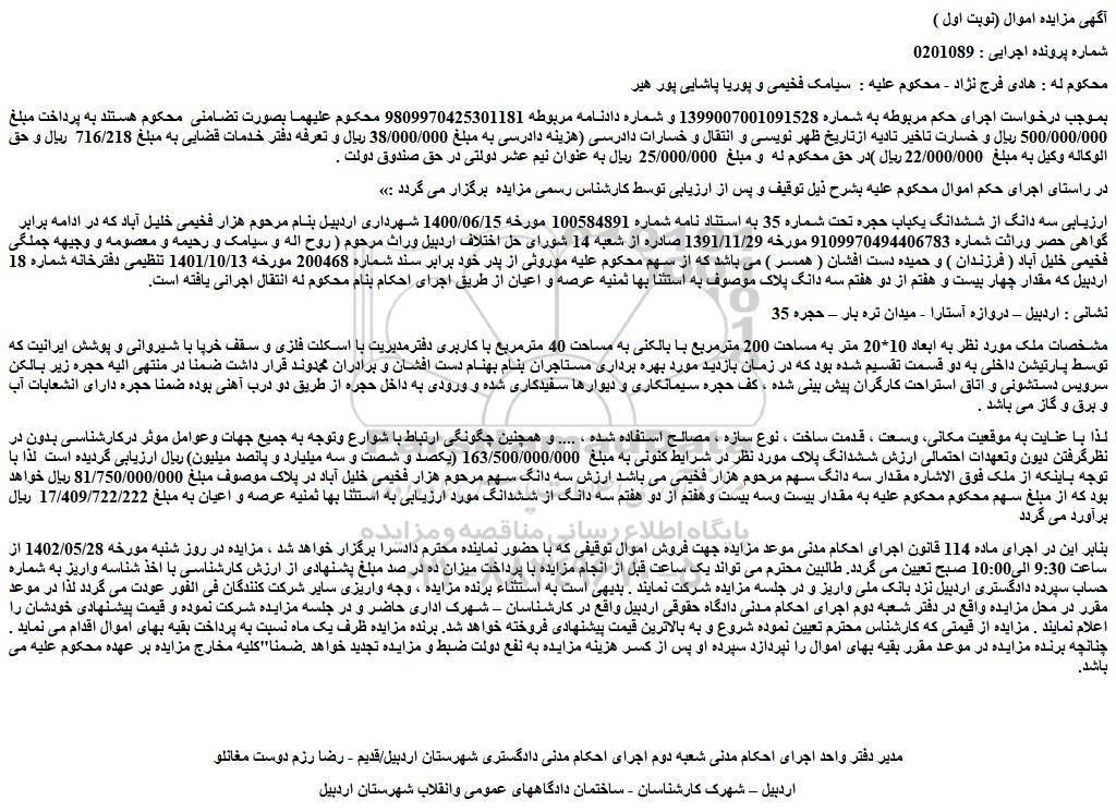 ارزیابی سه دانگ از ششدانگ یکباب حجره تحت شماره 35 به استناد نامه شماره 100584891 مورخه 1400/06/15 شهرداری اردبیل بنام مرحوم هزار فخیمی خلیل آباد که در ادامه برابر گواهی حصر وراثت شماره 9109970494406783 مورخه 1391/11/29 صادره از شعبه 14 شورای حل اختلاف اردبیل وراث مرحوم ( روح اله و سیامک و رحیمه و معصومه و وجیهه جملگی فخیمی خلیل آباد ( فرزندان ) و حمیده دست افشان ( همسر ) می باشد که از سهم محکوم علیه موروثی از پدر خود برابر سند شماره 200468 مورخه 1401/10/13 تنظیمی دفترخانه شماره 18 اردبیل که مقدار چهار بیست و هفتم از دو هفتم سه دانگ پلاک موصوف به استثنا بها ثمنیه عرصه و اعیان از طریق اجرای احکام بنام محکوم له انتقال اجرائی یافته است.
