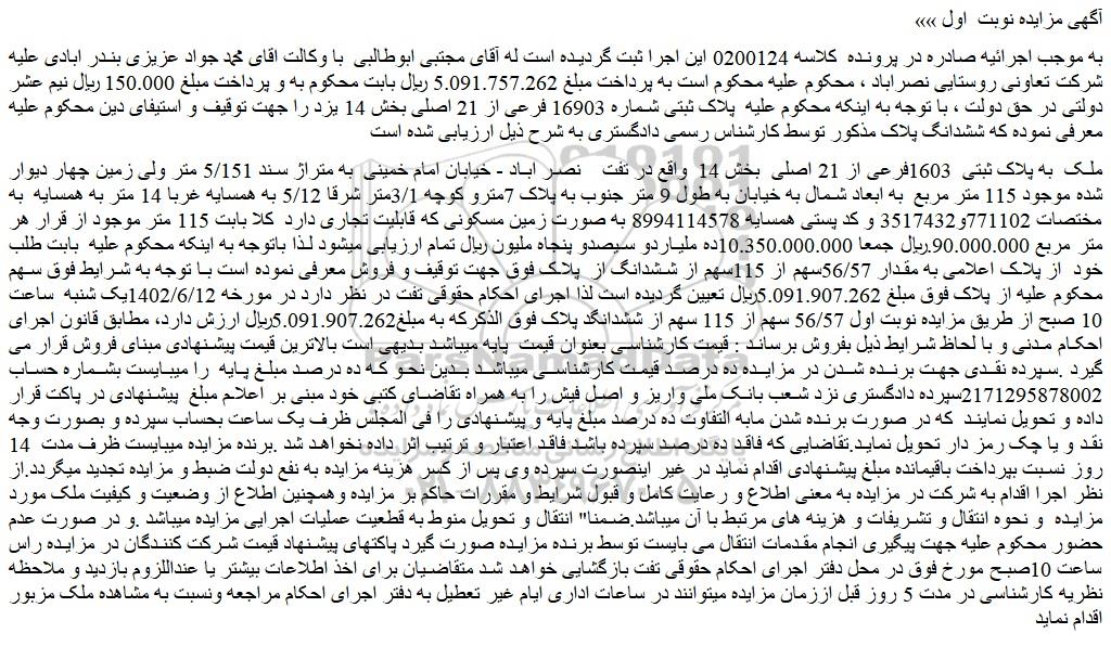 به موجب اجرائیه صادره در پرونده کلاسه 0200124 این اجرا ثبت گردیده است له آقای مجتبی ابوطالبی با وکالت اقای محمد جواد عزیزی بندر ابادی علیه شرکت تعاونی روستایی نصراباد ، محکوم علیه محکوم است به پرداخت مبلغ 5.091.757.262 ریال بابت محکوم به و پرداخت مبلغ 150.000 ریال نیم عشر دولتی در حق دولت ، با توجه به اینکه محکوم علیه پلاک ثبتی شماره 16903 فرعی از 21 اصلی بخش 14 یزد را جهت توقیف و استیفای دین محکوم علیه معرفی نموده که ششدانگ پلاک مذکور توسط کارشناس رسمی دادگستری به شرح ذیل ارزیابی شده است