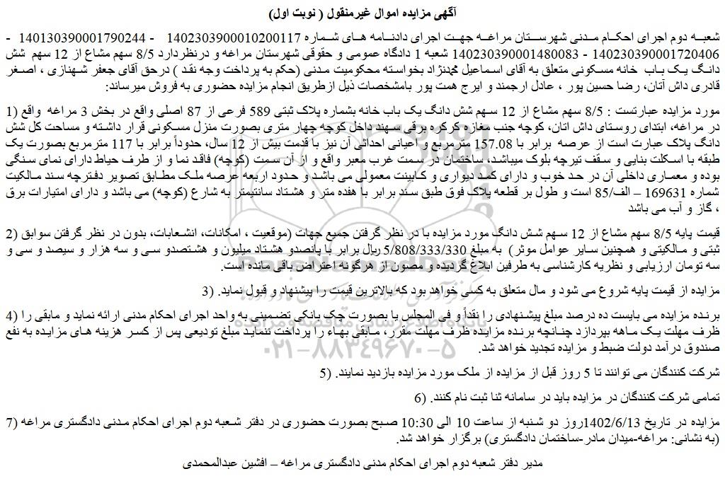 شعبه دوم اجرای احکام مدنی شهرستان مراغه جهت اجرای دادنامه های شماره 1402303900010200117 - 140130390001790244 - 140230390001720406 - 140230390001480083 شعبه 1 دادگاه عمومی و حقوقی شهرستان مراغه و درنظردارد 8/5 سهم مشاع از 12 سهم  شش دانگ یک باب  خانه مسکونی متعلق به آقای اسماعیل محمدنژاد بخواسته محکومیت مدنی (حکم به پرداخت وجه نقد ) درحق آقای جعفر شهنازی ، اصغر قادری داش آتان، رضا حسین پور ، عادل ارجمند و ایرج همت پور بامشخصات ذیل ازطریق انجام مزایده حضوری به فروش میرساند: