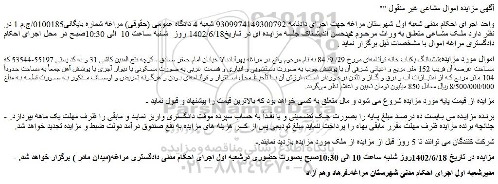 "آگهی مزایده اموال مشاعی غیر منقول "