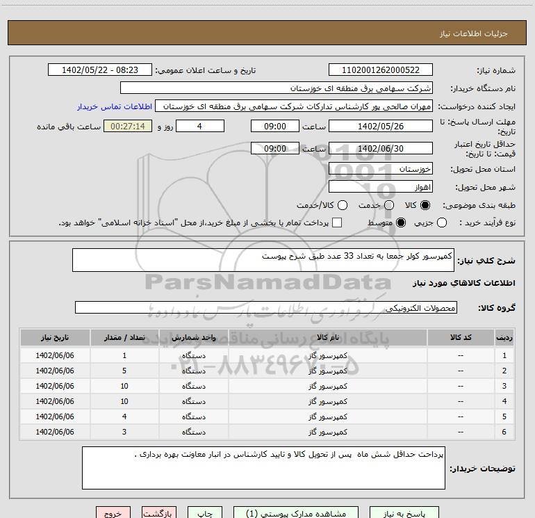 شرح کلی نیاز: کمپرسور کولر جمعا به تعداد 33 عدد طبق شرح پیوست
