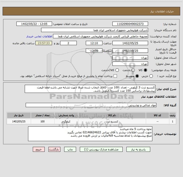 شرح کلی نیاز: کنسرو ذرت 3 کیلویی - تعداد :100 عدد -کالای انتخاب شده صرفا جهت تشابه می باشد-لطفا قیمت پیشنهادی براساس 100 عدد کنسرو3کیلویی باشد.