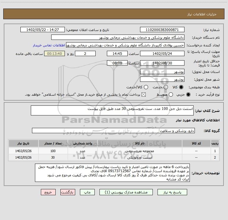 شرح کلی نیاز: استنت دبل جی 100 عدد، ست نفروستومی 30 عدد طبق فایل پیوست