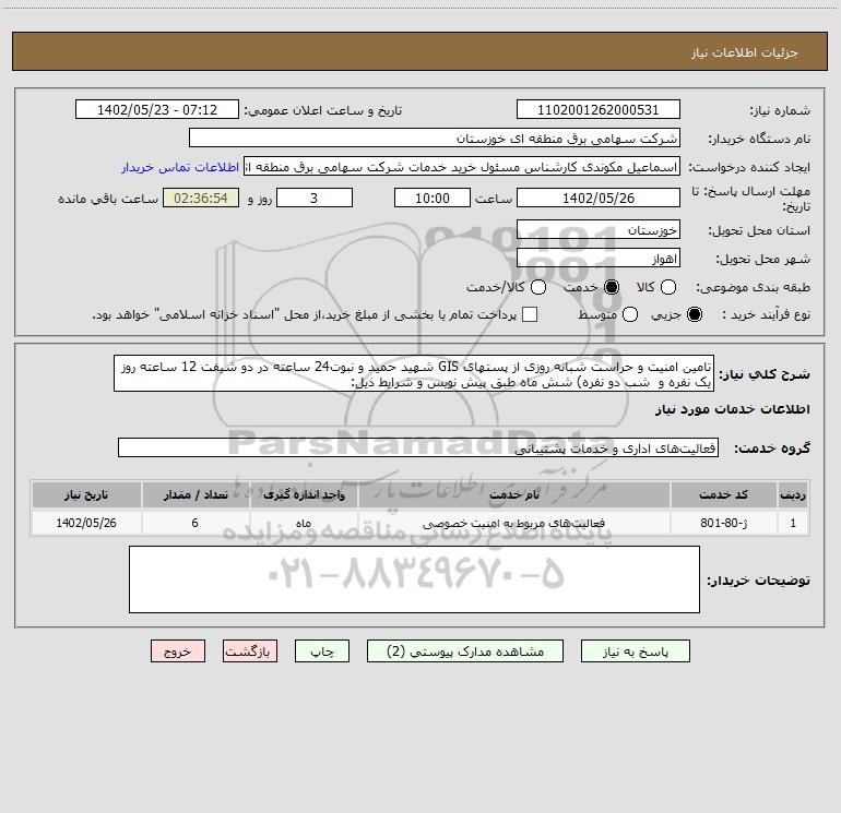 شرح کلی نیاز: تامین امنیت و حراست شبانه روزی از پستهای GIS شهید حمید و نبوت24 ساعته در دو شیفت 12 ساعته روز یک نفره و شب دو نفره) شش ماه طبق پیش نویس و شرایط ذیل: