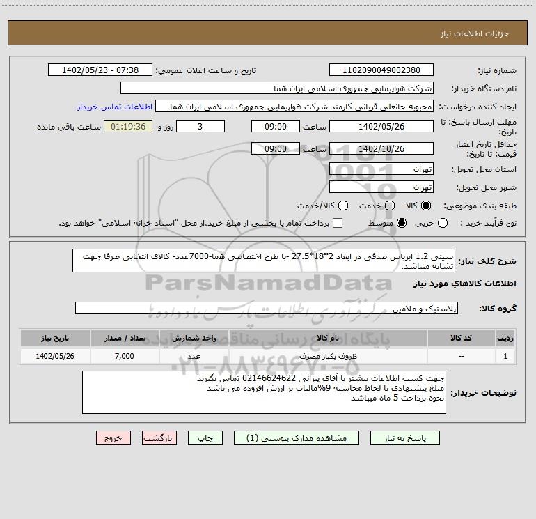 شرح کلی نیاز: سینی 1.2 ایرباس صدفی در ابعاد 2*18*27.5 -با طرح اختصاصی هما-7000عدد- کالای انتخابی صرفا جهت تشابه میباشد.