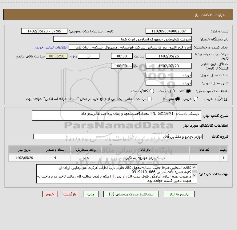 شرح کلی نیاز: دیسک بادسان PN: 6311GM1 ،تعداد4عدد،نحوه و زمان پرداخت مالی:دو ماه