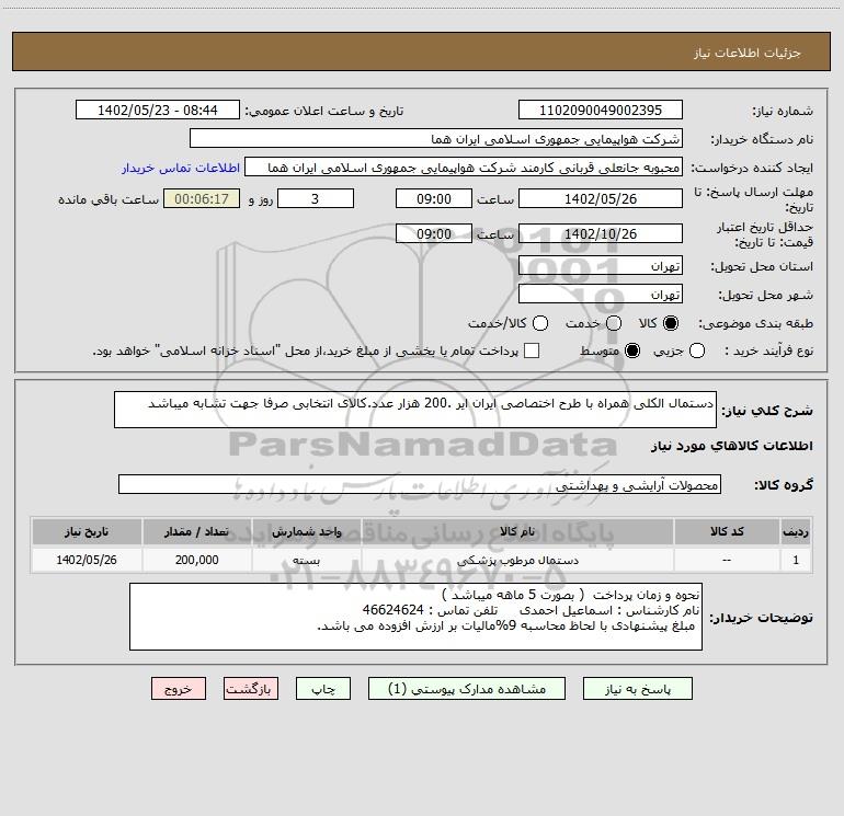 شرح کلی نیاز: دستمال الکلی همراه با طرح اختصاصی ایران ایر .200 هزار عدد.کالای انتخابی صرفا جهت تشابه میباشد