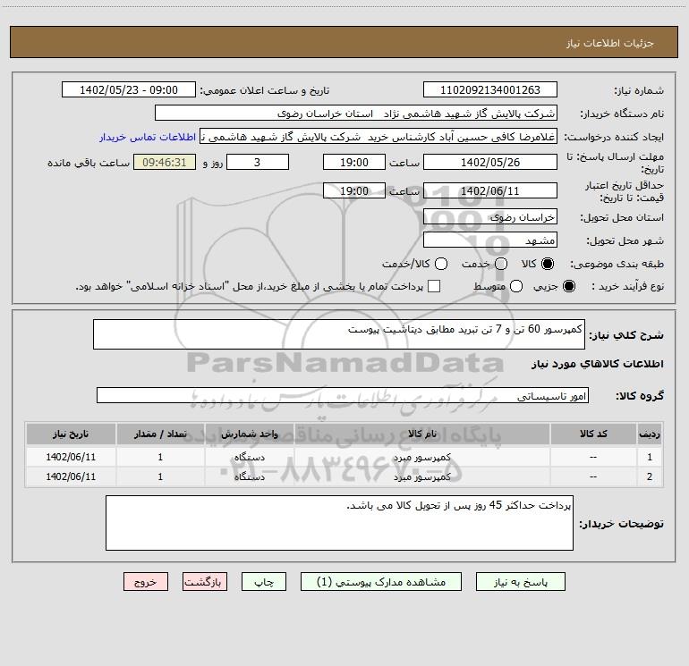 شرح کلی نیاز: کمپرسور 60 تن و 7 تن تبرید مطابق دیتاشیت پیوست