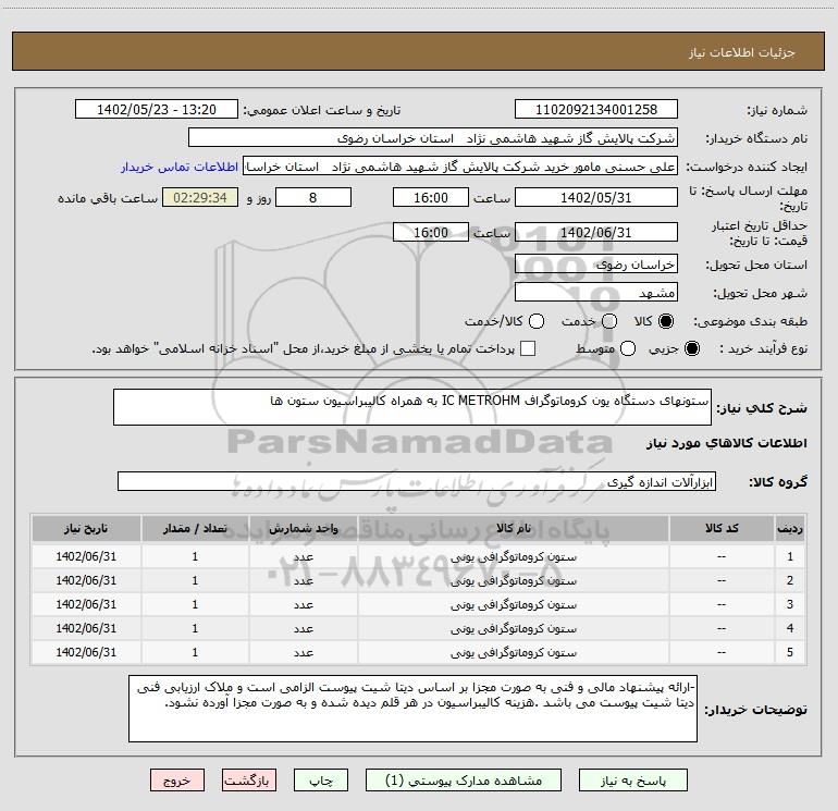 نام دستگاه خریدار:شرکت پالایش گاز شهید هاشمی نژاد استان خراسان رضوی
