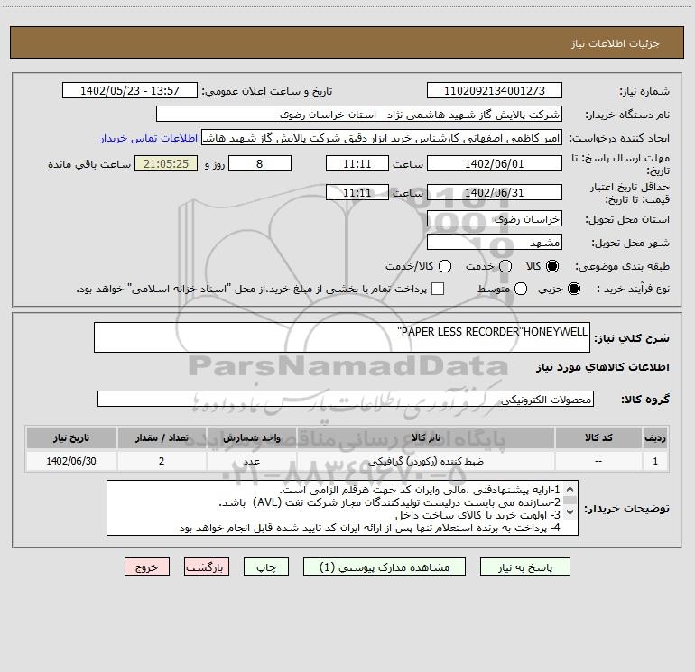 شرح کلی نیاز: PAPER LESS RECORDER"HONEYWELL"