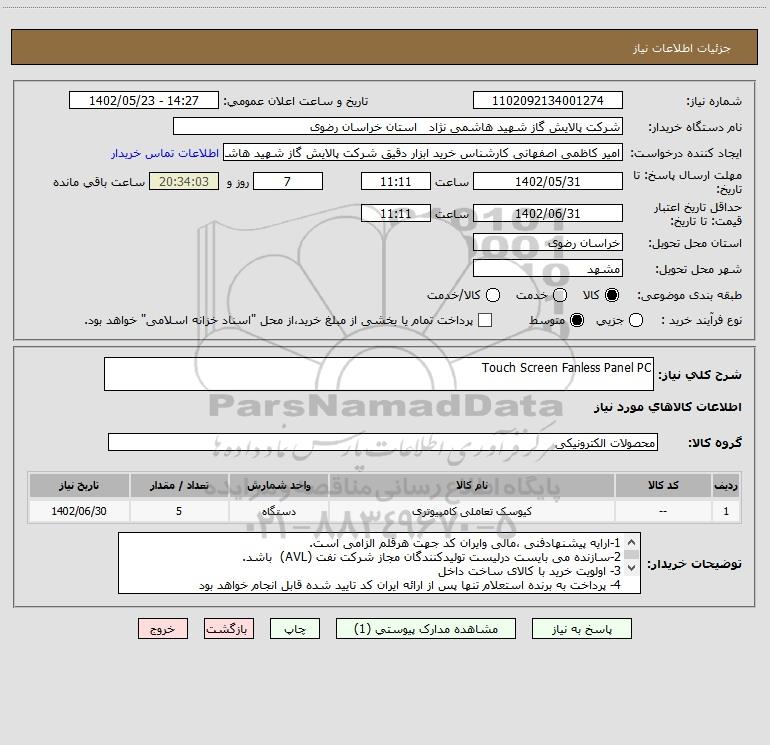 شرح کلی نیاز: Touch Screen Fanless Panel PC