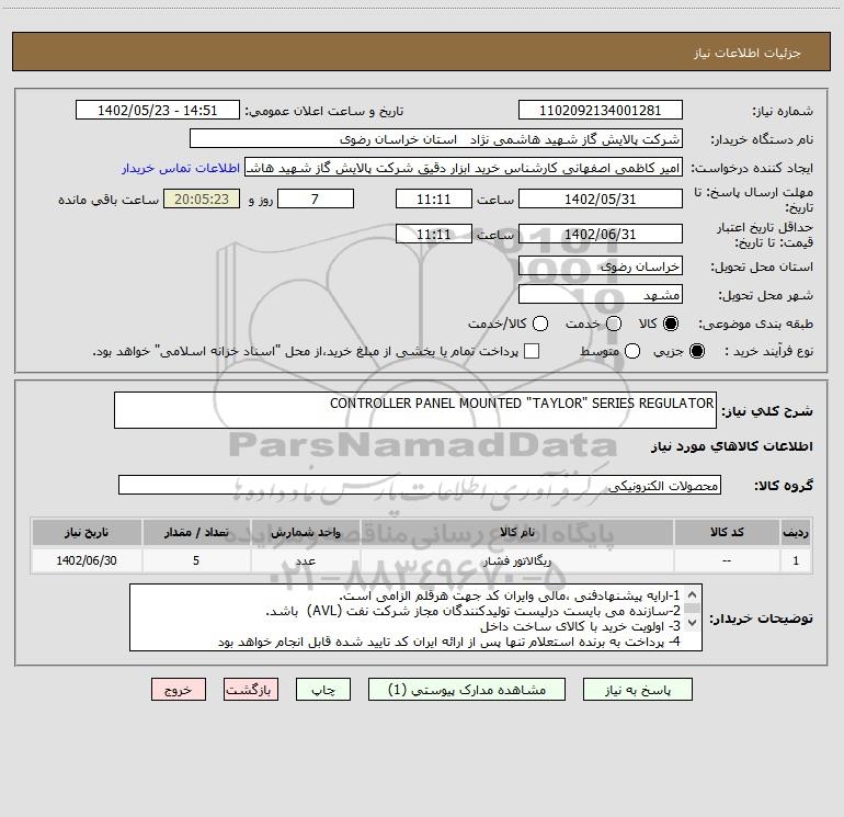 شرح کلی نیاز: CONTROLLER PANEL MOUNTED "TAYLOR" SERIES REGULATOR