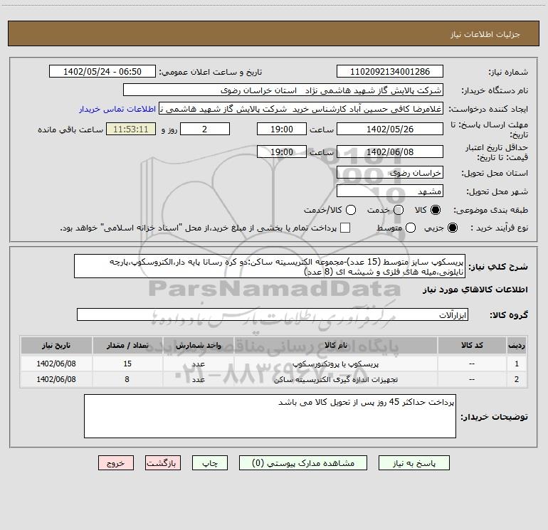 نام دستگاه خریدار:شرکت پالایش گاز شهید هاشمی نژاد استان خراسان رضوی