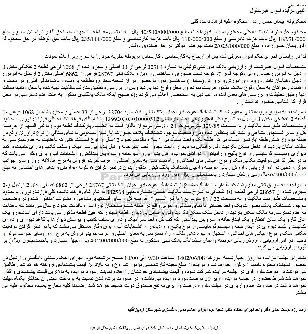 مشخصات اموال عبارتست از : ارزیابی پلاک های ثبتی توقیفی به شماره 32704 فرعی از 33 اصلی و مجزی شده از 1068 فرعی قطعه 2 تفکیکی بخش 3 اردبیل به آدرس : خیابان والی ،کوچه قدس 7، کوچه شهید صبوری ، ساختمان آروین و پلاک ثبتی 28767 فرعی از 6862 اصلی بخش 2 اردبیل به آدرس : اردبیل ،خیابان دانش ، روبروی آموزش و پرورش (سابق ) ساختمان نورا با حضور در آن شعبه محترم ومطالعه پرونده و باهماهنگی قبلی و در معیت و راهنمائی خواهان به محل وقوع املاک مذکورعزیمت نموده وازمحل وقوع آنها بازدید وپس از بررسی وتطبیق مدارک مالکیت تهیه شده با محل وتائیداصالت آنها وطبق تحقیقات و بررسی های بعمل آمده مراتب ذیل به استحضار اعلام می گردد :(توضیح اینکه مالک پلاکهای مذکور به علت عدم دسترسی در محل قرار کارشناسی حضور نداشتند ) .