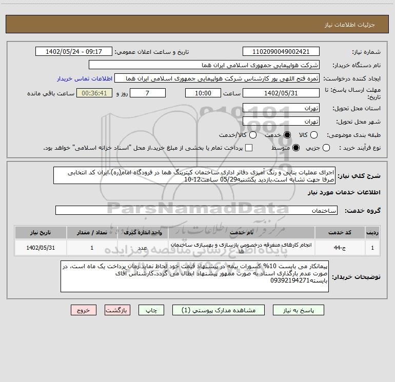 شرح کلی نیاز: اجرای عملیات بنایی و رنگ آمیزی دفاتر اداری ساختمان کیترینگ هما در فرودگاه امام(ره)،ایران کد انتخابی صرفا جهت تشابه است.بازدید یکشنبه05/29 ساعت12-10