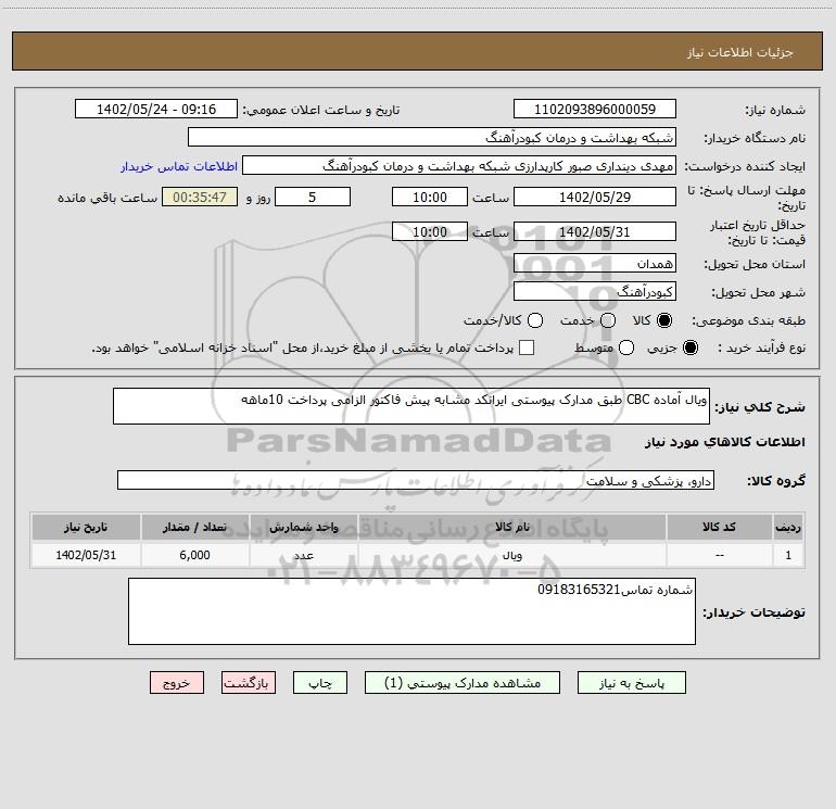 شرح کلی نیاز: ویال آماده CBC طبق مدارک پیوستی ایرانکد مشابه پیش فاکتور الزامی پرداخت 10ماهه