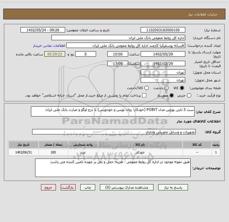شرح کلی نیاز: ست 3 تایی یوروپن مدل POINT (خودکار- روان نویس و خودنویس) با درج لوگو و عبارت بانک ملی ایران