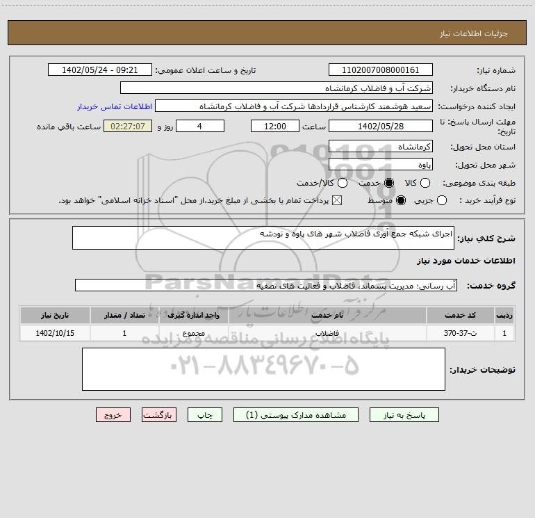 شرح کلی نیاز: اجرای شبکه جمع آوری فاضلاب شهر های پاوه و نودشه