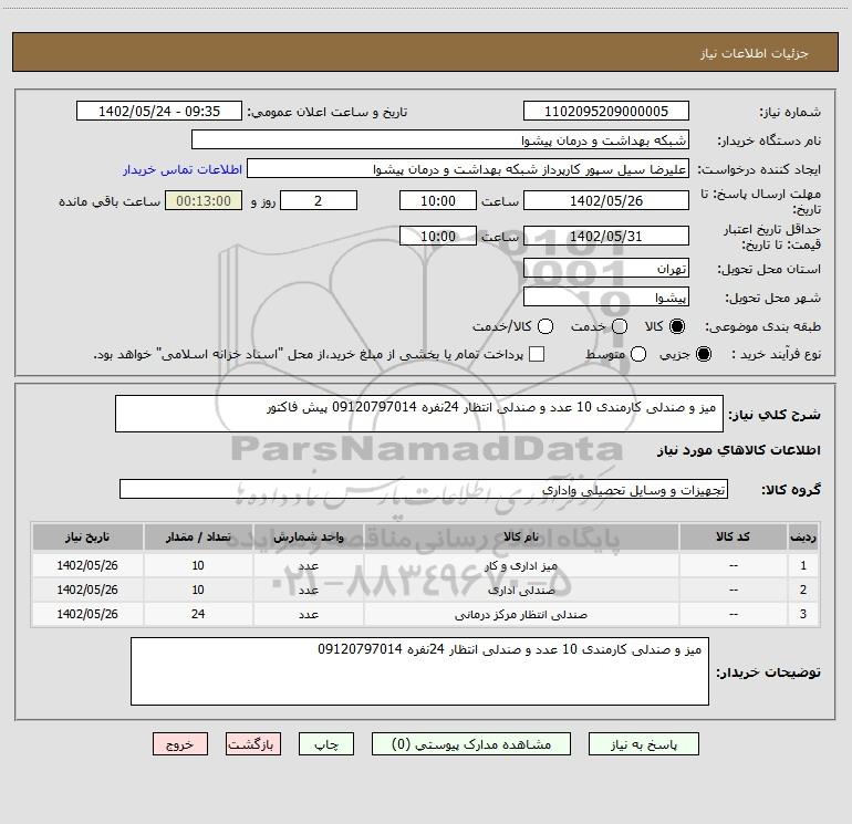شرح کلی نیاز: میز و صندلی کارمندی 10 عدد و صندلی انتظار 24نفره 09120797014 پیش فاکتور