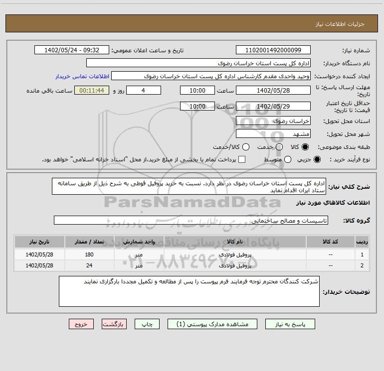 شرح کلی نیاز: اداره کل پست استان خراسان رضوی در نظر دارد. نسبت به خرید پروفیل قوطی به شرح ذیل از طریق سامانه ستاد ایران اقدام نماید