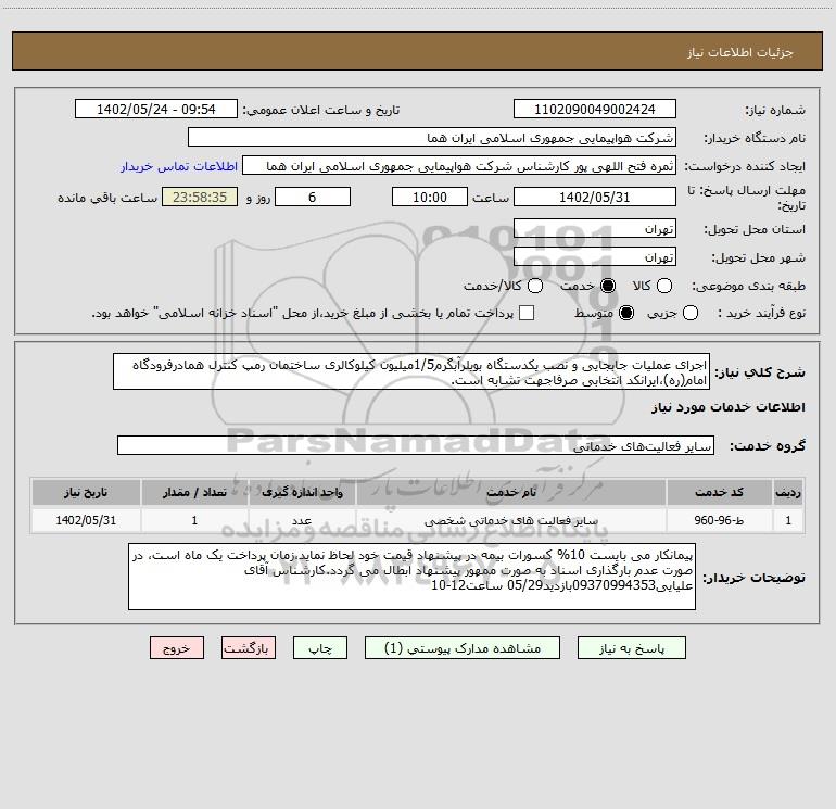 شرح کلی نیاز: اجرای عملیات جابجایی و نصب یکدستگاه بویلرآبگرم1/5میلیون کیلوکالری ساختمان رمپ کنترل همادرفرودگاه امام(ره)،ایرانکد انتخابی صرفاجهت تشابه است.