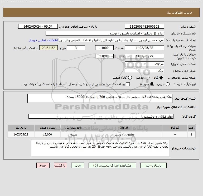شرح کلی نیاز: ماکارونی رشته ای 1/5 سبوس دار بسته سلفونی 700 g تاریخ دار 15000 بسته