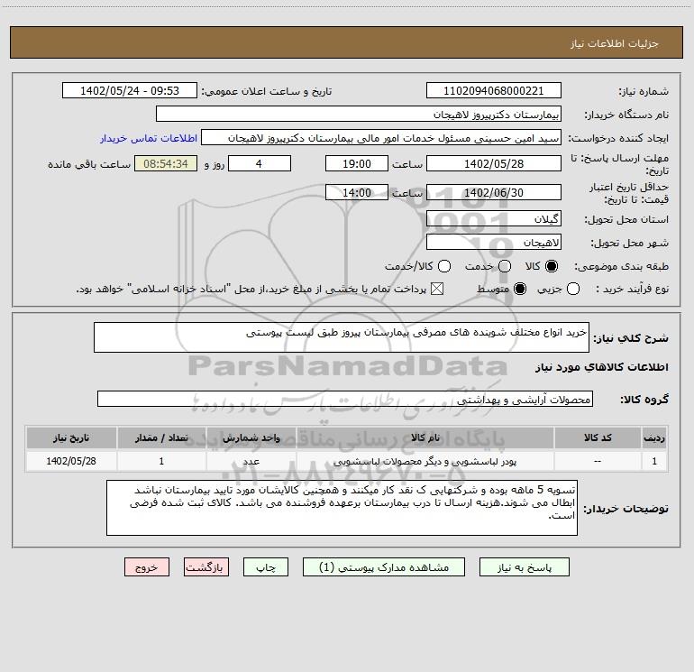 شرح کلی نیاز: خرید انواع مختلف شوینده های مصرفی بیمارستان پیروز طبق لیست پیوستی