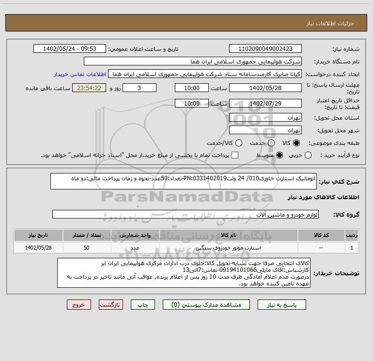 شرح کلی نیاز: اتوماتیک استارت خاوری010/ 24 ولتPN:0331402019-تعداد:50عدد-نحوه و زمان پرداخت مالی:دو ماه